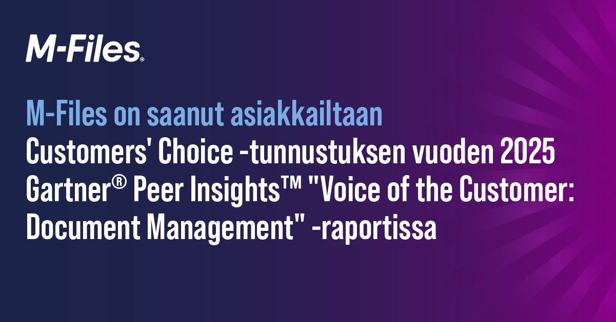 Kokeile M-Filesia ilmaiseksi 30 päivän ajan! Tutustu M-Files Ainon GenAI-ominaisuuksiin, tehosta yhteistyötä kollegoiden kanssa, automatisoi työnkulkuja ja avaa ovet loputtomiin mahdollisuuksiin.